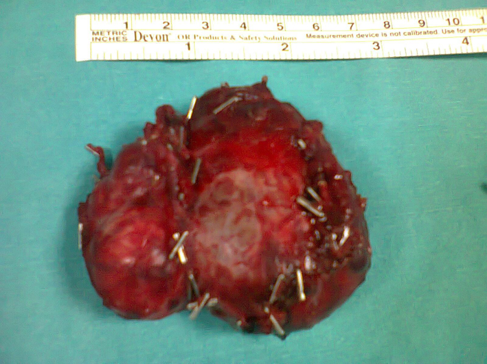 Starting after doxazosin (selective α1 blocker) and phenoxybenzamine (α-adrenergic blockage) combination, BP showed slight tendency of lowering, but was stable at levels of 130 - 140 mmHg for systolic blood pressure (SBP) and 90 - 100 mmHg for diastolic blood pressure (DBP). With the stable BP values, he went to operation. Operation material was sent for pathologic exam. Following the operation, our patient’s antihypertensive requirements were significantly reduced. End organ damage was searched. Ventricular mass index and non-nephrotic level of proteinuria were increased. Two weeks postoperatively, ultrasound revealed any mass for residual tumor and metastatic disease. Urinary catecholamine and metabolite concentrations were within the normal range after a follow-up of 3 months. Histopathological examination of the excised tissue confirmed a 5 х 5.5 cm solid heterogeneous tumor invasing renal capsule (Fig. 3). Microscopic evaluation revealed pheochromocytoma, with infiltration of the capsule. Iodine-131-metaiodobenzylguanidine scintigraphy, performed 3 months after operation, confirmed complete excision with no evidence of metastatic disease. Our patient is symptom-free with normal urinary catecholamine and metabolites and normal BP for 3 years (Table 1).