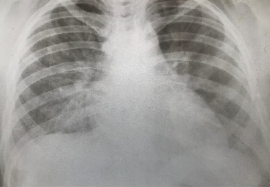 On objective examination the skin was pale, capillary refill time more than 4 s, the radial pulse was mild, cardiac tones without murmur, tachycardia with frequency 120 bpm, arterial tension was low with value of 100/65 mm Hg, in lungs auscultation crepitant rhonchus on bilateral fields was heard and on lower right lobe the respiration was reduced.