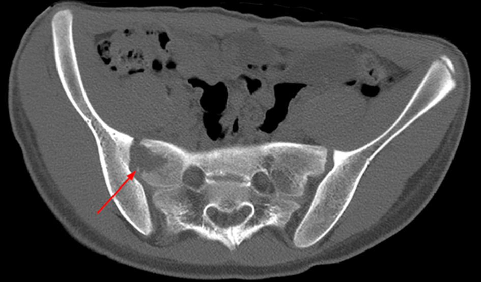 ![]() Click for large image | Figure 3. Axial CT of the pelvis, bone setting, showing an osteolytic lesion in the right sacrum (arrow). CT: computed tomography. |